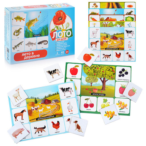 Картонное малое развивающее детское лото "Лето в деревне" поможет ребенку лучше узнать окружающий его мир. Познакомиться с тем, что может окружать его вдали от городской среды - овощи, ягоды и фрукты, животные, обитатели рек. Каждое игровое поле имеет свою тематику. Цель игры заключается в том, чтобы закрыть все малые изображения на карточке. В игре могут участвовать 2, 3 или 6 человек, в возрасте от трех лет. В зависимости от количества игроков, каждый участник получает одну или несколько больших карточек. Ведущий складывает малые карточки в мешочек и вынимает по одной. Выигрывает тот, кто первым закрыл все малые изображения на карточке.