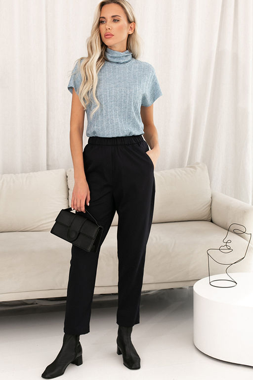 Брюки из фактурной костюмной ткани, зауженные книзу. На передней части брюк имитация гульфика. Пояс с эластичной резиной. Карманы с подкройным бочком и настроченным контуром.