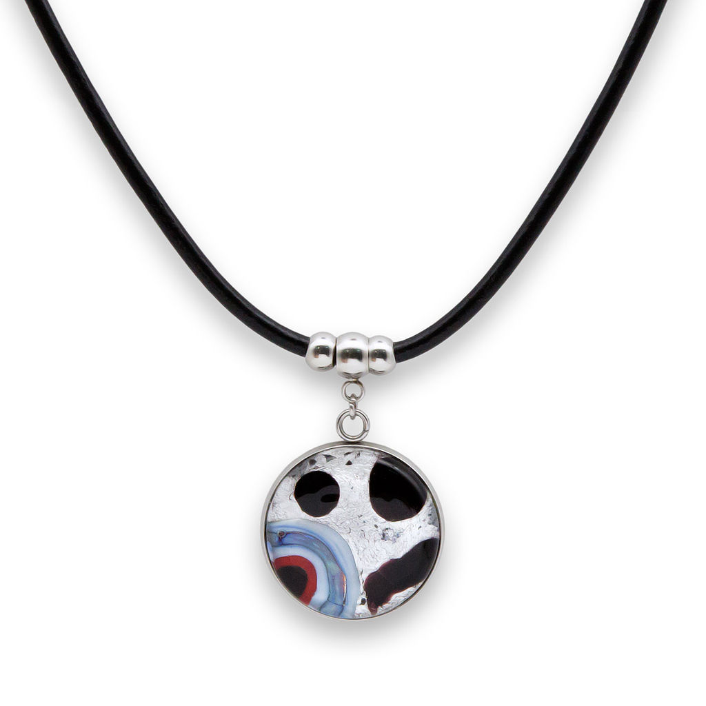 Колье изготовлено из натуральной кожи, муранского стекла и гипоаллергенной ювелирной стали, что очень важно для людей с чувствительной кожей. Металл не темнеет и не подвергается воздействиям окружающей среды, надолго обеспечивая красивый внешний вид изделия. Длина колье - 46 см + 5 см. удлиняющая цепочка. Диаметр стеклянного элемента - 2,5 см. Вес - 15 гр.­