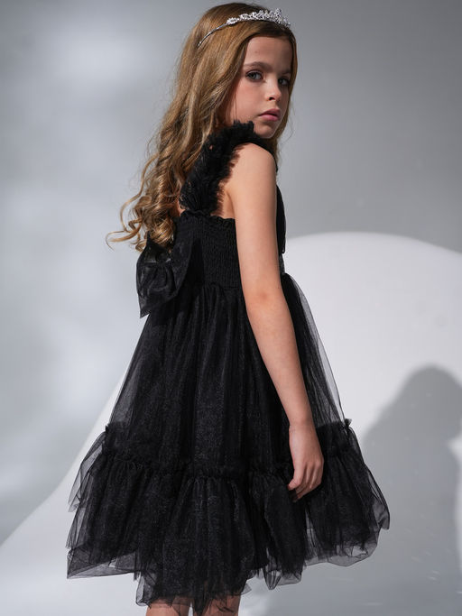 Праздничное платье из фатина идеальный выбор для девочки на выпускной, день рождения, Новый год. Платье воздушное и легкое с пышной юбкой, оборкой по низу юбки и изящными бретелями. Лиф платья выполнен из присборенного фатина, а на спинке присобран резинкой. Оригинальный пояс из пайеток на полочке очень украшает платье, на спинке модный пышный бант из фатина. Платье очень приятно к телу за счет хлопкового подклада. Ткань верха: 100% Polyester, Подклад:100% cotton