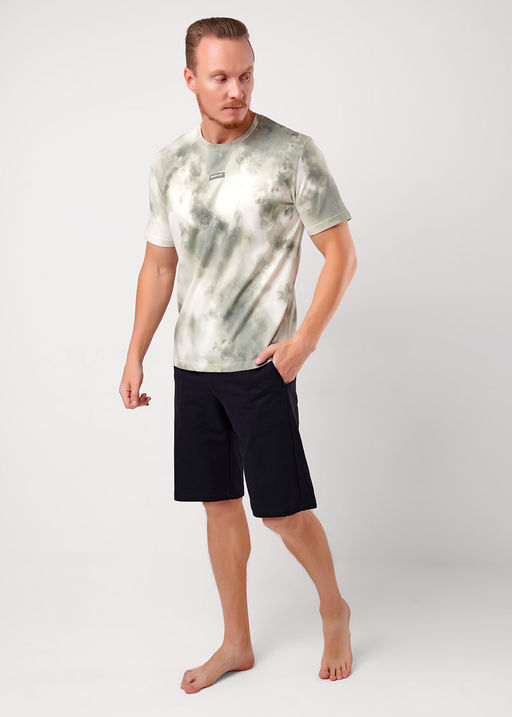 Набор мужской для дома состоящий из футболки и шорт. Футболка из хлопковой кулирной глади в набивку с округлой горловиной, коротким рукавом и стильной нашивкой. Шорты из однотонного футера на эластичном поясе с функциональными карманами и шнуром. 100% хлопок