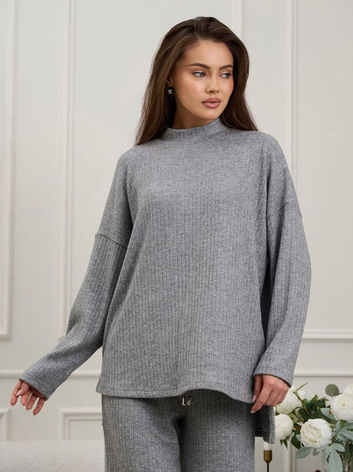 Женский лонгслив свободного кроя с воротником стойка и разрезами по бокам.