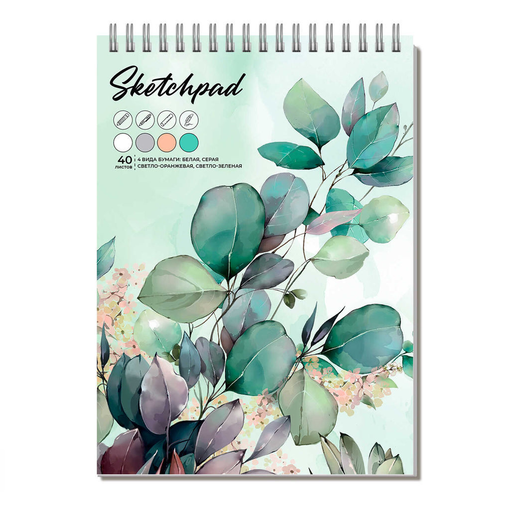 Альбом для рисования (Скетчпад) А5 40 л, 4 вида бумаг, арт. 67744 ЗЕЛЕНЫЕ ЛИСТЬЯ/ блок - белый офсет, зелёный офсет, оранжевый офсет, серый офсет 80 г/м?, обложка - полноцветная печать, гребень по короткой стороне, жёсткая подложка,