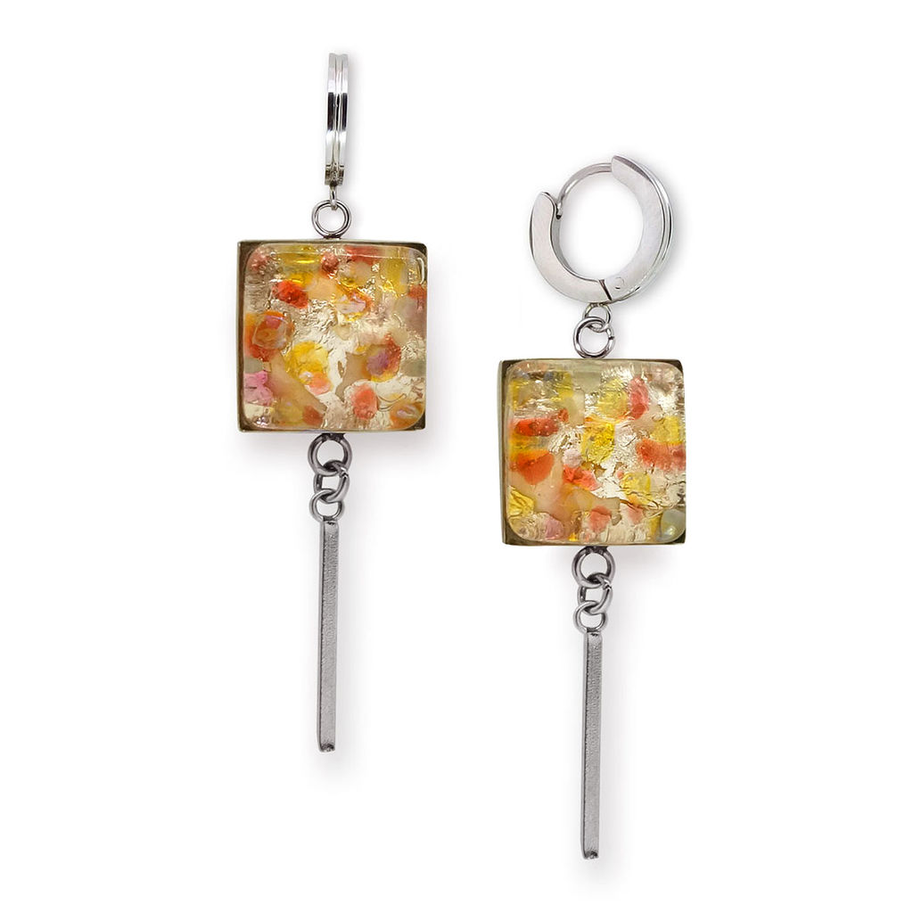 Серьги изготовлены из муранского стекла и гипоаллергенной ювелирной стали, что очень важно для людей с чувствительной кожей. Металл не темнеет и не подвергается воздействиям окружающей среды, надолго обеспечивая красивый внешний вид изделия. Длина серег - 6,5 см. Размер  стеклянного элемента 1,6х1,6 см. Вес - 12 гр.