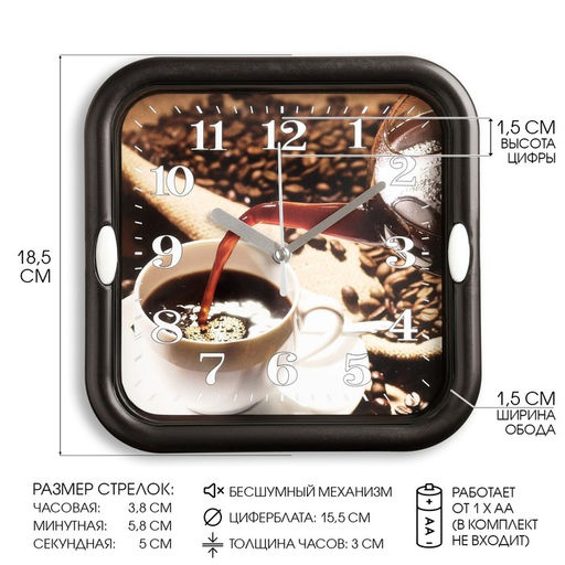 Часы настенные "Кофе" станут настоящим украшением и дополнением вашего интерьера. Модель можно разместить дома в гостиной, спальне, кухне или в офисе. Интересный дизайн и использованная цветовая гамма изделия придадут любому помещению нотки уюта и гармонии. Стильные необычные часы удачно оформят любой интерьер от современного до детского. Наши часы идеально подойдут в качестве подарка детям и друзьям. Форма: Квадратная. Ширина, см: 18.5. Высота, см: 18.5. Тематика: Кухня. Тип механизма: Кварцевый. Размеры товара: 3/18.5/18.5.