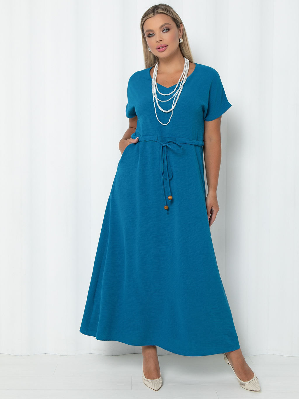 Летнее длинное платье свободного силуэта из ткани с рельефной поверхностью.