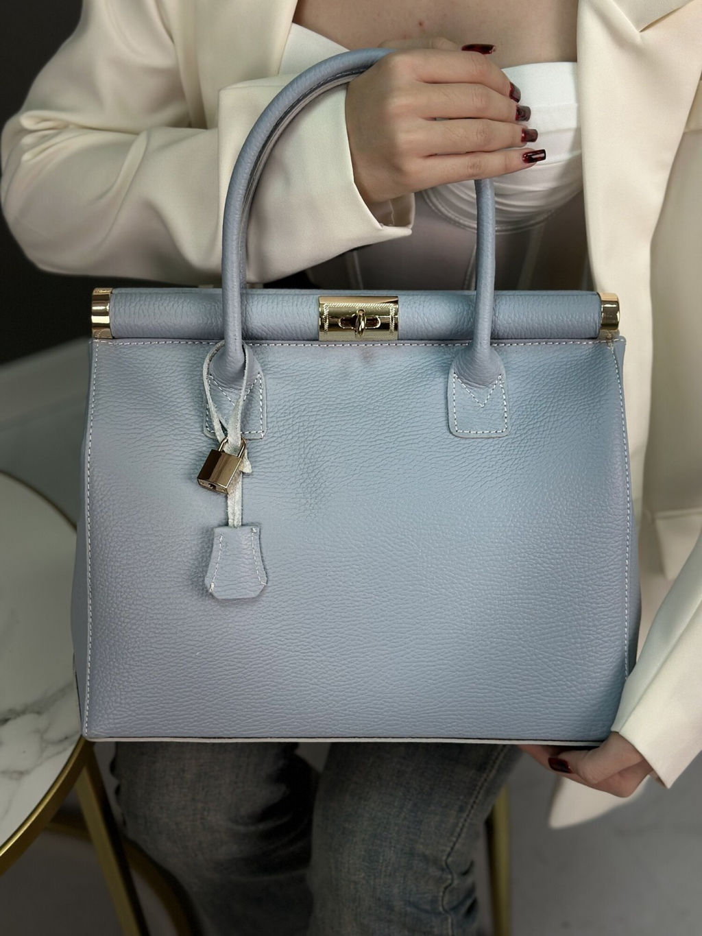 Сумочка имеет каркасную форму саквояжа, вместительная, яркая, выполнена из мягкой телячьей кожи зернистой износостойкой выделки надежной и прочной, может использоваться как повседневная модель, органично смотрится в деловом образе, классическом луке.