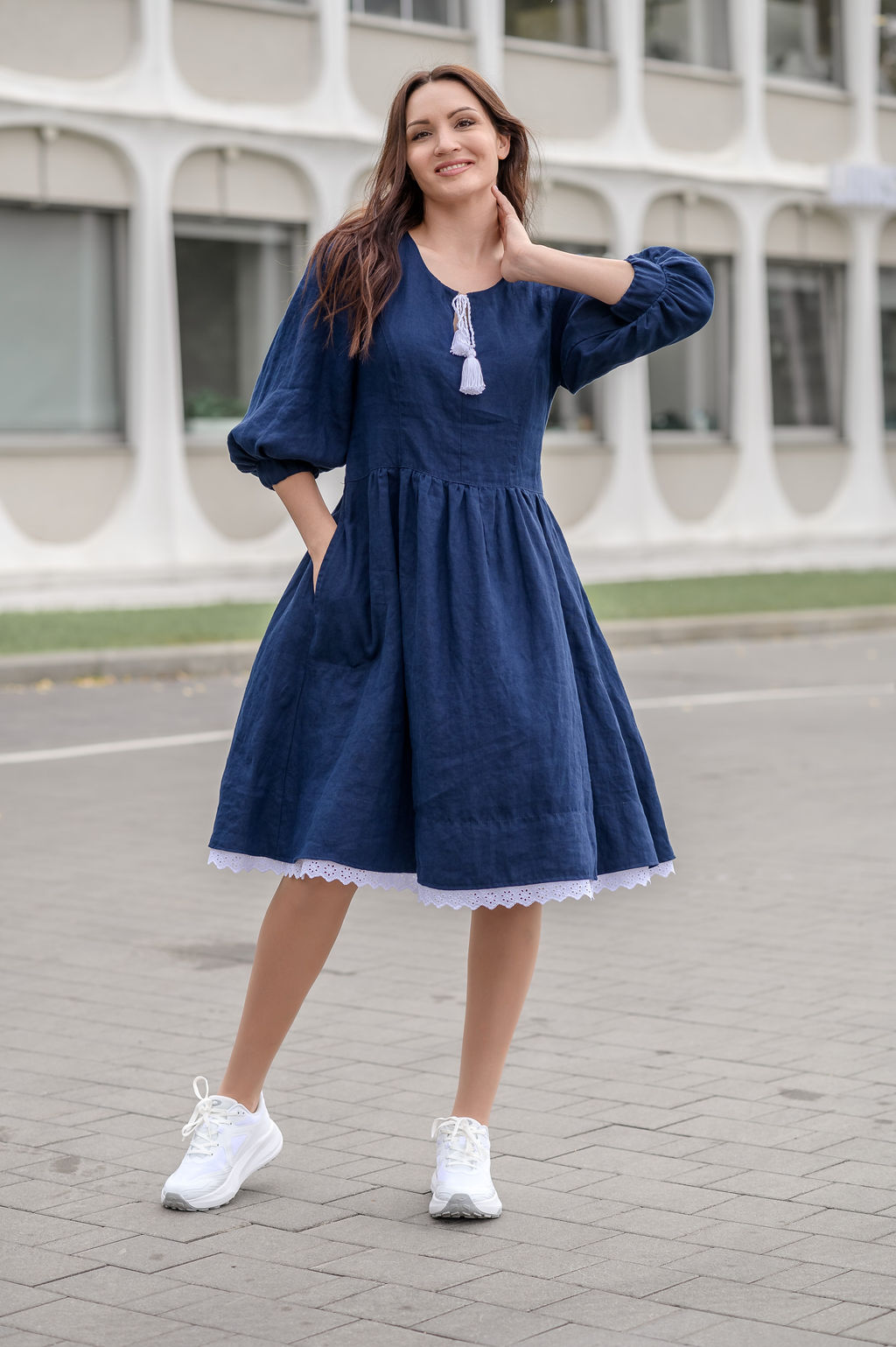 Льняное свободное платье в стиле прованс. Широкий втачной рукав на манжете, визуально сужает ширину плеч и придает модели воздушность. Изделие декорировано по низу х/б шитьем белого цвета. Имеются 2 боковых кармана.