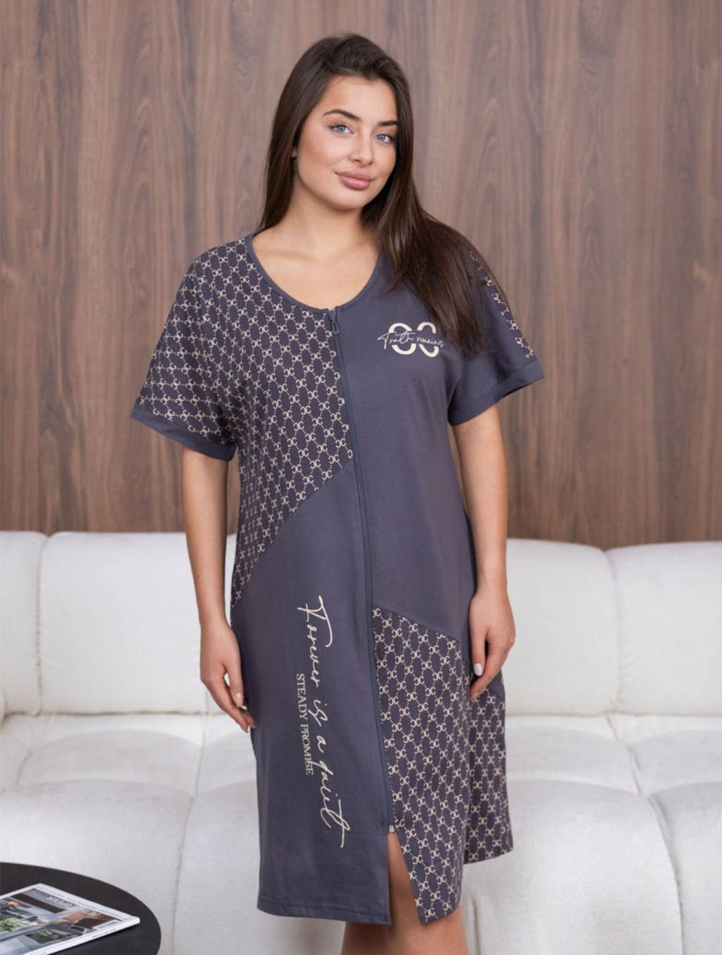 Женский комбинированный халат с принтом на молнии. Халат прямого силуэта с о-образной горловиной и карманами в боковых швах. Рост модели 165см.­