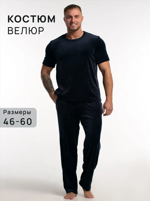 Домашний мужской костюм из велюра - это прекрасный выбор для тех, кто ценит комфорт и уют. Комплект состоит из мягкой футболки и удобных брюк, выполненных из высококачественного велюрового материала. Мужская футболка имеет классический крой, короткие рукава и круглый вырез. Брюки прямого покроя с эластичным поясом и карманами по бокам.­