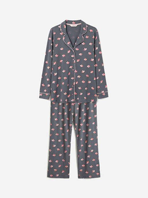 G?mlek Yaka Kalp Bask?l? Kad?n Pijama Tak?m
