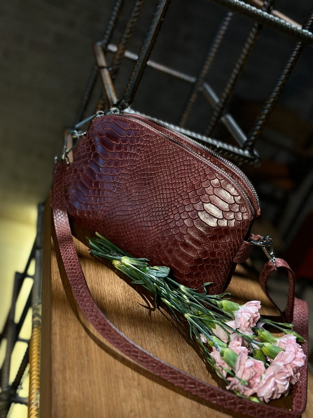 Сумочка выполнена из мягкой телячьей кожи с выделкой под кожу питона  прочной и красивой. Модель очень практичная, мягкой формы, сочетается с вещами в стиле Casual, будет органично смотреться в классическом, деловом, винтажном, либо повседневном образах. Несмотря на небольшой размер, сумочка довольно вместительная, 3 независимых отделения.