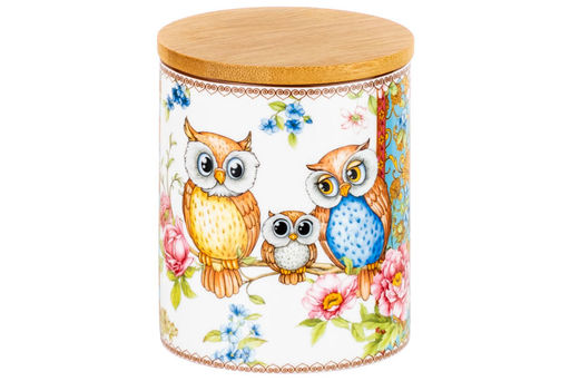 • Банка д/хранения 650 мл 10*10*12,5 см "Совушки" с деревянной крышкой с силик.уплотн. NEW BONE CHINA