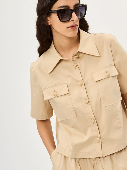 Легкая блузка прямого кроя с накладными карманами и коротким рукавом. Удобный крой и мягкая смесовая ткань обеспечивают комфорт и легкость в носке. Универсальный оттенок добавляет образу свежести, создавая стильный и непринужденный летний образ. Идеальна для повседневной носки, прогулок или отдыха. Простой и универсальный дизайн легко сочетается с джинсами, шортами или юбками, делая блузку практичным и стильным выбором для теплых дней.