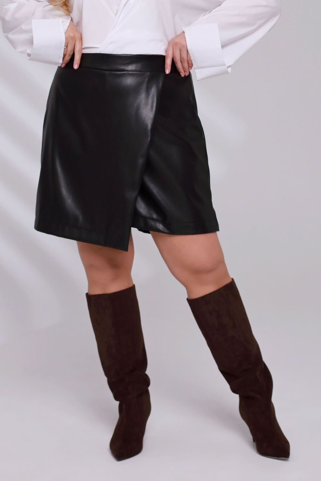 Шорты из мягкой экокожи отлично сидят за счет комфортной посадки и эластичной резинки на поясе сзади. Имитация юбки спереди добавляет оригинальности, а асимметричный низ визуально стройнит и зрительно вытягивает силуэт.  Модель не сковывает движений, прекрасно подчёркивает фигуру и привлекательно выглядит. Благодаря свободному крою создается ощущение комфорта, свободы и раскованности. Данная модель идеальный вариант для прогулок и отдыха. Эти шорты будут прекрасно смотреться как с лёгкими блузками, так и со строгими пиджаками и жакетами.