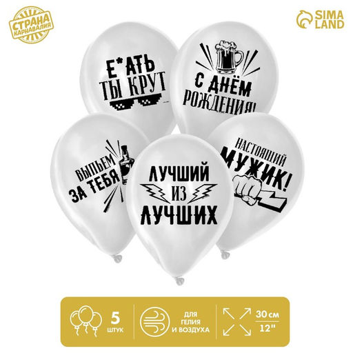 В набор входят шары с надписями:выпьем за тебянастоящий мужикс днём рождения!е*ать ты крутлучший из лучшихКоличество шаров может отличаться от представленного на фото Набор: Да. В наборе, шт.: 5. Диаметр, дюйм: 12. Тематика праздника: День рождения. Тематика рисунка: День Рождения. Вид шара: Классический. Вид шара: Надписи-приколы. Надувка шара: Гелием. Надувка шара: Воздухом. Язык надписи: Русский. Бесплатная доставка: Да. Наша разработка: Да.