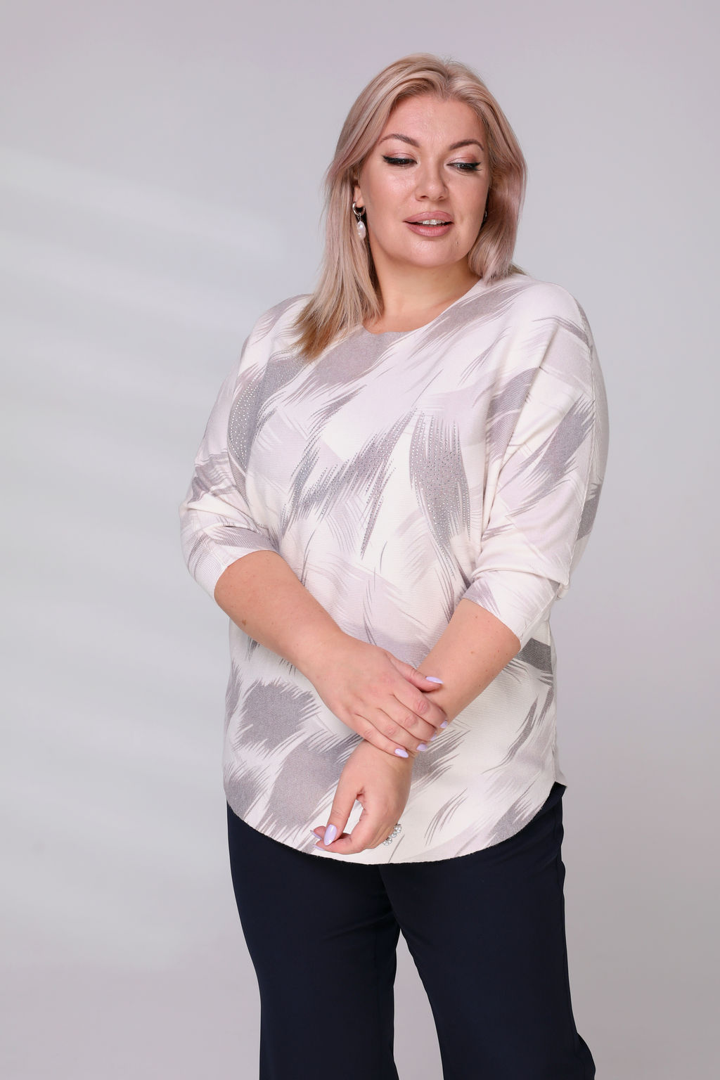 Джемпер прямого кроя из мягкого трикотажа с добавлением нитей кашемира согреет Вас в холодную погоду. Имеет круглый вырез и приспущенные рукава длиной 3/4.  Закругленные бока способствуют оптимальной посадке по фигуре. Оригинальный принт  добавляет динамичности и освежает образ. Такая универсальная модель подходит ко всему, а приятный на ощупь материал - обеспечивает комфорт и уют на весь день. Модель  отлично сочетается с брюками и юбками.­