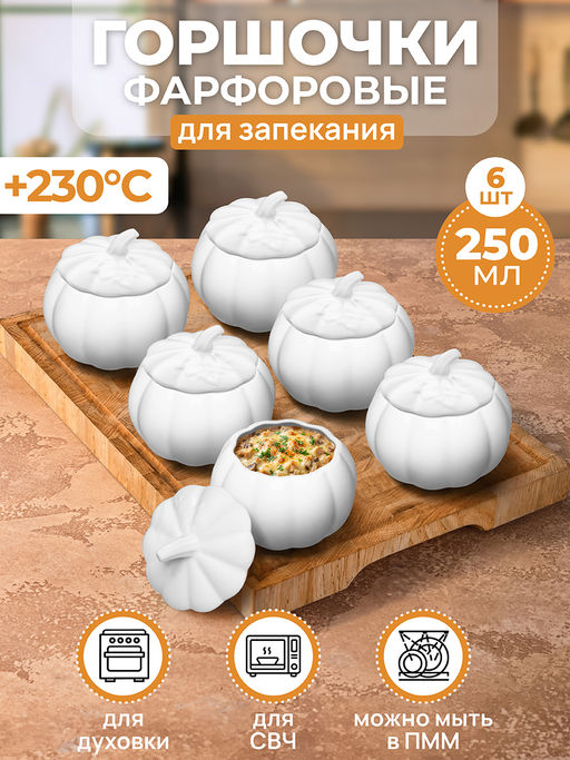 • Набор горшочков д/запекания 6 пр. 250 мл 10*10*8,5 см "Тыква", белый, фарфор