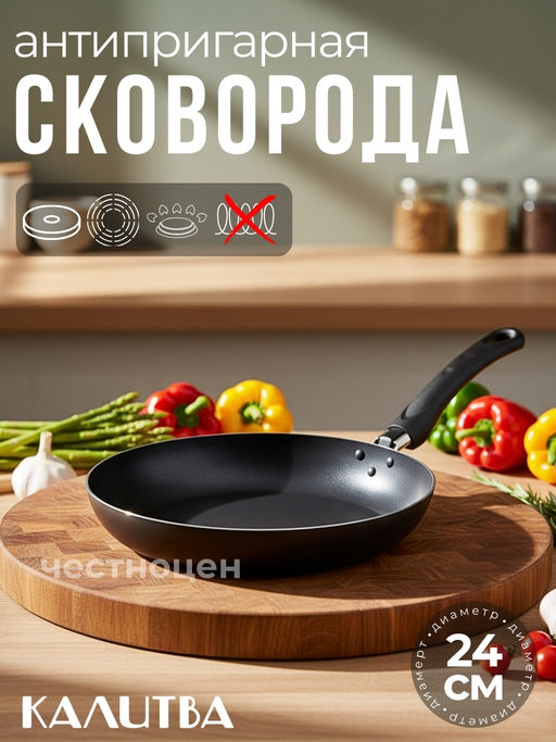 Сковорода без крышки диаметром 24 см без крышки базовый предмет из линейки кухонной посуды с антипригарным покрытием бренда Калитва. Штампованный пищевой алюминий, антипригарное покрытие, нанесенное методом наката, высокая износостойкость и доступная цена с таким набором характеристик сковорода Атлас нужна в каждом доме и опытному кулинару, и новичку. Эргономичная бакелитовая ручка не нагревается и защищает руки от ожога. Легкий прочный металл, практичный антрацитовый цвет и крепкая фурнитура подходят для интенсивного использования на газовых, электрических и керамических плитах. Диаметр, см-24 Высота, см-4,5 Толщина, мм-1,9 Антипригарное покрытие Покрытие: Внутреннее - антипригарное Scandia Whitford, внешнее - Xylac Whitford. -- Характеристики -- Артикул: 68241 Кол-во в заводской упаковке: 1 Кол-во в упаковке: 14 Материал: Алюминий штампованный с антипригарным покрытием Торговая марка: КАЛИТВА Размер изделия- длина, ширина, высота (см): 24*24*4,5 Размер упаковки- длина, ширина, высота (см): 590х310х330 Страна Производитель: Россия Покрытие: Антипригарное покрытие Серия/Коллекция: Атлас Диаметр (см): 24