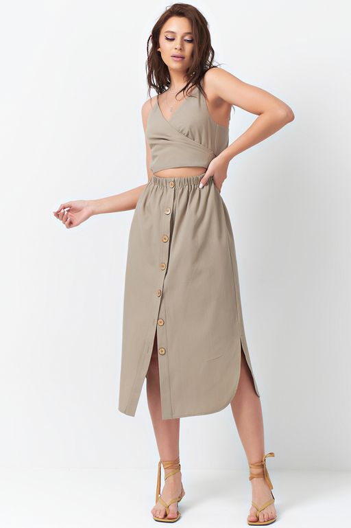 Особенности: Платье прилегающего силуэта из плательной ткани. Детали: тонкие бретели с регуляторами, отрезное по линии талии со сборкой на резину, лиф переда с запахом переходящим в завязку на спинке, карманы в боковых швах, фигурная линия низа с разрезами в боковых швах, по переду юбки планка с застежкой на петли-пуговицы.