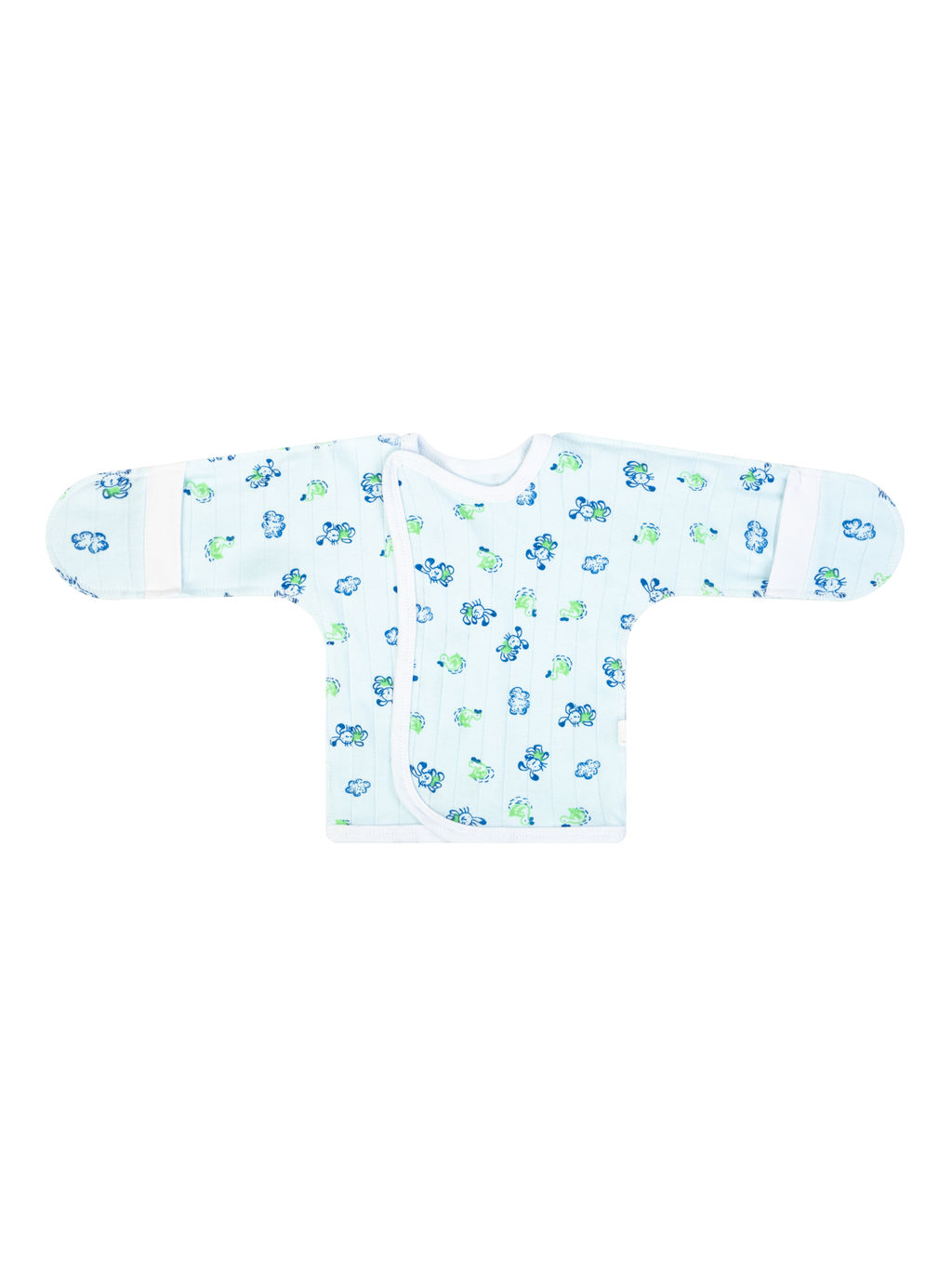 Ясельная кофточка-распашонка швами наружу с манжетиками на рукавах и клапаном для закрытия ручек. Можно делать открытое и закрытое положение рук для малыша. Края обработаны трикотажной бейкой. Распашонка застегивается на запах на кнопочку на плече. Сшита из мягкого, гипоаллергенного, дышащего хлопкового трикотажа голубого цвета с принтом утки.