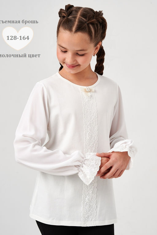 Блузка для девочек младшего и старшего школьного возраста, из трикотажного полотна кулирка с лайкрой и шифона. Блузка прилегающего силуэта, с втачным рукавом. Перед и спинка выполнены из трикотажного полотна, рукава из шифона. По центру переда от горловины до низа настрочено кружево. Рукава снизу присборены на резинку. По низу рукавов насточено кружево. Горловина окантована. По центру горловины спереди прикреплен декоративный элемент. Низ изделия подогнут.