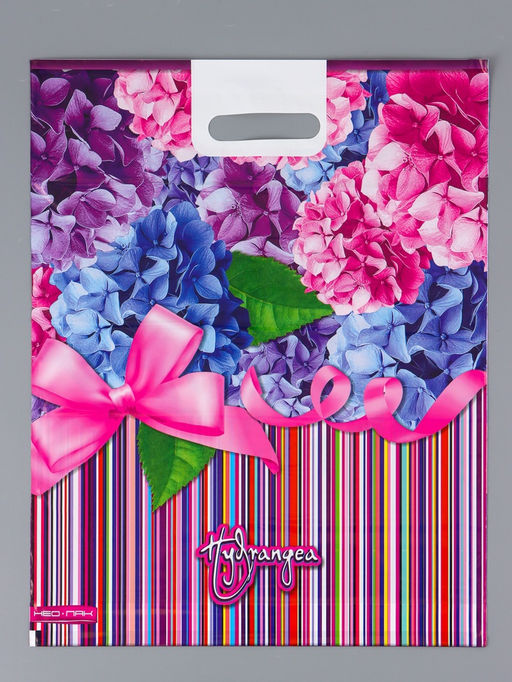 * Дизайн с акцентом на пышность и объём: Гортензия известна своими крупными, массивными соцветиями. Их изображение в розовых тонах вместе с графичным бантом передаёт ощущение щедрости и праздничной полноты. Пакет подходит для подарка, где важно создать впечатление богатого букета.