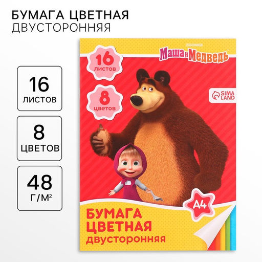 Цена за 5 шт. Цветная бумага, А4, 16 листов, 8 цветов, немелованная, двусторонняя, на скрепке, 48 г/м², «Маша и медведь»