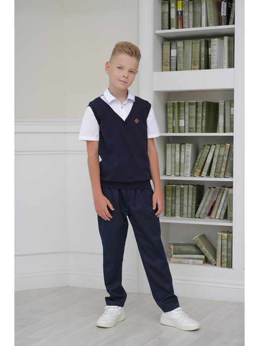 Брюки-джоггеры для мальчика из костюмной ткани, прямые, с наклонными боковыми карманами. На правой задней половинке карман в листочку. Передние половинки на подкладке. Пояс с эластичной тесьмой внутри и со шнуром. Состав:32% вискоза, 63% полиэстер, 5% лайкра