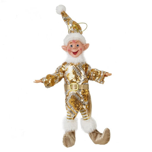 Веселый декоративный Эльф в праздничном золотом костюме и колпаке заряжает радостью. Он имеет реалистичные лицо и кисти рук из полимерных материалов. Уникальность игрушки заключается в том, что благодаря проволоке внутри рук и ног можно создавать различные позы, что добавляет игривости образу. Благодаря петле на колпаке, эту игрушку можно легко повесить на елку или другое место в интерьере.