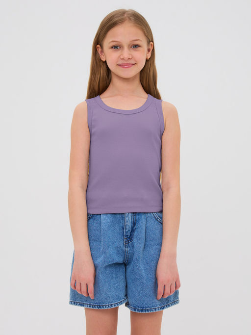 Майка для девочки из кашкорсе, облегающего силуэта чуть ниже талии. Состав:92% хлопок, 8% лайкра