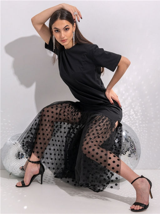 платье,хлопок 90% + лайкра 8% + пэ 2%,кулир с лайкрой / хлопок 90% + лайкра 8% + пэ 2%,- / черный+черный горох 15 на черном / - / - / - / -,Длинное платье Oversize из легкого хлопкового полотна с лайкрой. Изделие с короткими рукавами со спущенным плечом. По низу многослойная пышная оборка из сетки. Уход: только деликатная стирка при температуре 40 градусов, без предварительного замачивания.