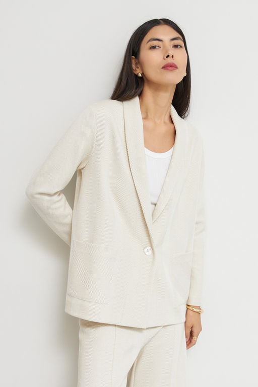 Жакет из эластичного полотна прямого свободного кроя с женственным шалевым воротником. На передней части изделия застежка на пуговицу и накладные карманы. Втачной рукав. Изделие с плечевыми накладками, которые при желании можно убрать.
