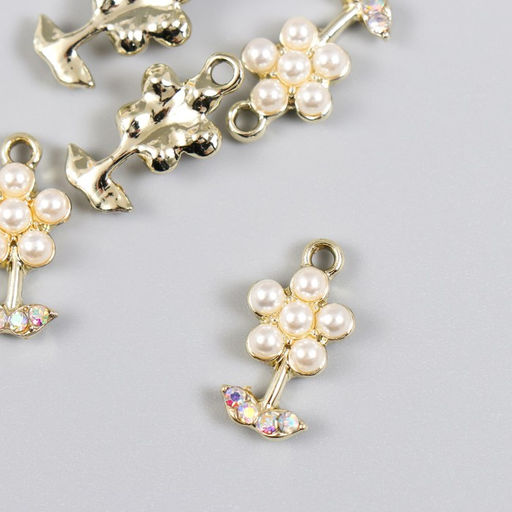 Цена за 5 шт. Декор для творчества металл, стразы Цветочек жемчужный с листиками, золото, 1.1?2 см