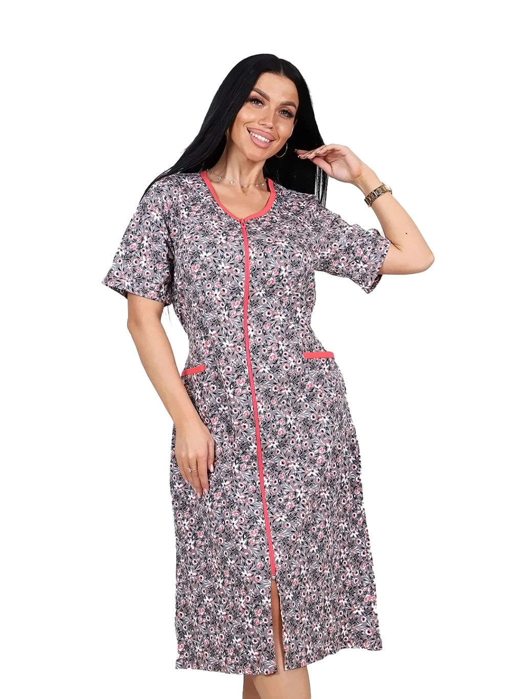 Халат женский из трикотажного полотна - кулирка, длиной ниже колена, прямого силуэта. Полочка с рельефами и карманами в них. Рукав втачной базового покроя длиной до линии локтевого сгиба.­