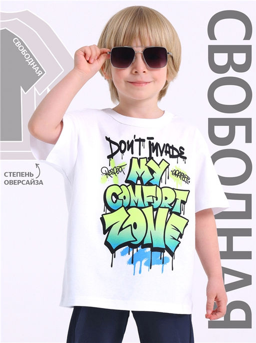 футболка,хлопок 100%,кулир / хлопок 100%,белый / - / Зона комфорта / - / - / -,Футболка для мальчика выполнена из кулира легкого хлопкового полотна. Изделие прямого силуэта и свободного кроя, с короткими рукавами со спущенной линией плеча, вырез горловины обработан эластичной бейкой из полотна компаньона. Футболка украшена печатью. Уход: только машинная стирка (руками не стирать!) при температуре 40 градусов, без предварительного замачивания. Изделия с печатью и декором перед стиркой необходимо вывернуть на изнаночную сторону.