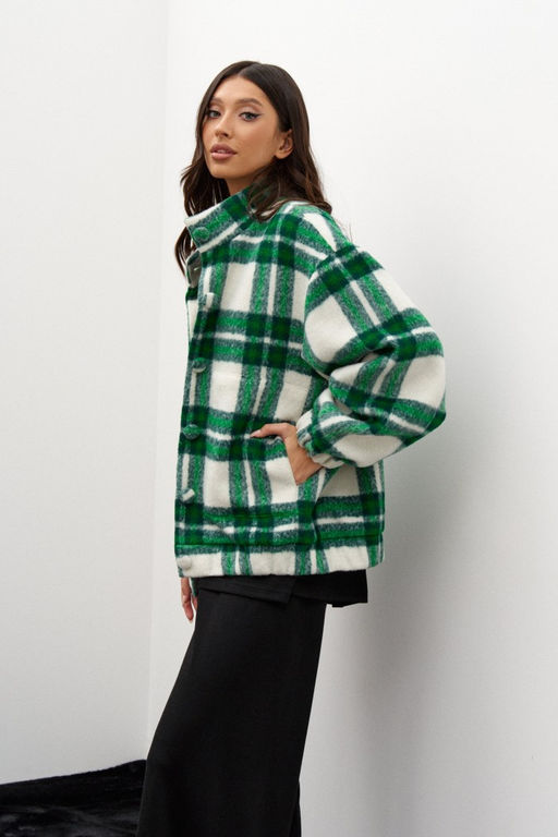 Бомбер выполнен из фактурного зеленого в клетку полотна. Характеристики: воротник-стойка, застёжка центральная на петли пуговицы, пуговицы выполнены из основной ткани изделия, есть подкладка, по переду изделия нашиты карманы, широкий спущеный рукав заканчивается манжетом-резинкой,по низу изделия резинка. Длина по спинке от края горловины 69 см, длина рукава от края горловины 79 см.