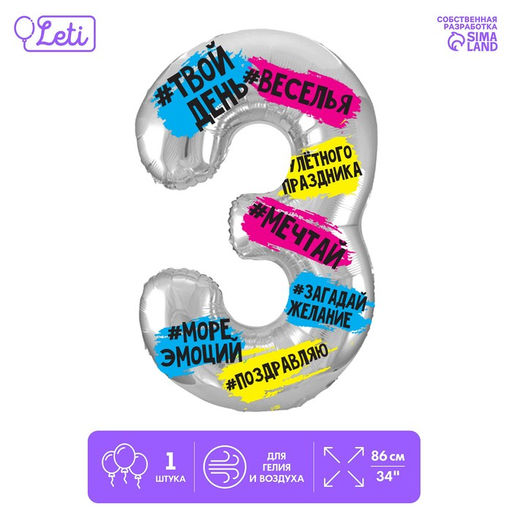 Фольгированный шар в виде цифры с хештегами — оригинальный способ поздравить с днём рождения. При необходимости, соберите число из двух шаров-цифр. Отлично подойдёт в качестве реквизита для фотосессии или оформления помещения.ОсобенностиРазмер шара — 34 дюйма (85 см).Шар подойдёт для надувания гелием или воздухом.Перед надуванием шары рекомендуется обработать специальным составом для более длительного пользования.Чтобы шар не деформировался избегайте воздействия прямых солнечных лучей, повышенной влажности и перепада температуры. Набор: Нет. Диаметр, дюйм: 34. Рисунок: Да. Тематика рисунка: День Рождения. Вид шара: Цифра. Наличие клапана: Да. Надувка шара: Гелием. Надувка шара: Воздухом. Бесплатная доставка: Да. Наша разработка: Да.