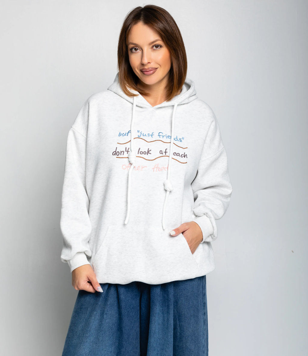 Худи это одежда, которая подчеркивает уникальность каждой женщины. Худи выполнено в свободном, слегка оверсайз крое с опущенной линией плеч. Модель с капюшоном на двойных шнурках, которые заканчиваются узлами, и с английской вышивкой или принтом в области груди, состоящим из нескольких строк рукописного стиля. Спереди располагается карман-кенгуру с боковыми входами, низ и манжеты рукавов оформлены широкими резинками для плотной посадки. Горловина аккуратно соединена с капюшоном швом под углом, швы ровные, конструкция цельная и минималистичная. Для пошива использована ткань 100% хлопок, которая характеризуется отличным качеством. Даже после многих стирок изделие не утратит первоначальной привлекательности. Вы сможете носить его с радостью. Обратите внимание на цвет и надпись, они являются стильными и полностью соответствуют фотографии на сайте. Чтобы вы были уверены в размере, мы представили на странице таблицу. Воспользовавшись ею, вы сможете сами обмерить себя и удостовериться. Предложенная нами цена является приемлемой. Не откажите себе в удовольствии быть неотразимой! -- Характеристики -- Цвет: серый Пол: Женский Страна производитель: Китай Сезон: Демисезон Материал: Хлопок