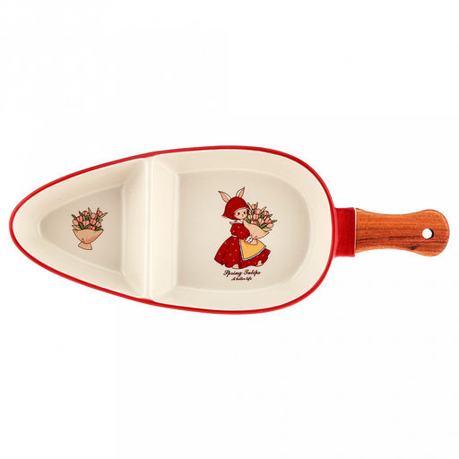 • "Зайка и тюльпаны" Блюдо-менажница-морковница фарфоровое 320х122х40мм, с деревянной ручкой, с деколью, отводка (Китай)