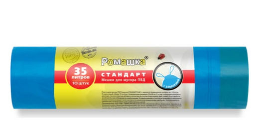 Мешки для мусора в рулоне с завязками (35 л, 10 шт, синие, ПВД, 25 мкм, 50х58 см) Ромашка ЗВС3510С изготовлены из полиэтилена высокого давления, синего цвета, с ароматом ванили.