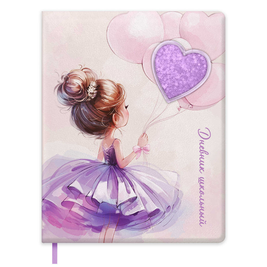 Дневник школьный арт. 72426 / 15 БАЛЕРИНА С ВОЗДУШНЫМИ ШАРИКАМИ (кожзам: А5+; твёрдый переплёт с поролоном, материал обложки: искусственная кожа "Наппа"; декор: аппликация в виде прозрачного пластикового окна с маслом, пайетками и глиттером внутри, печать полноцветная; способ крепления блока: ниткошвейный; вн. блок: 48 л., белый офсет 80 г/м?, печать в одну краску, справочный материал: универсальная шпаргалка; отделка среза: окрашивание пантоном; закладка: одно ляссе; форзац: печать в одну краску; индивидуальная упаковка: ПЭТ-пакет)
