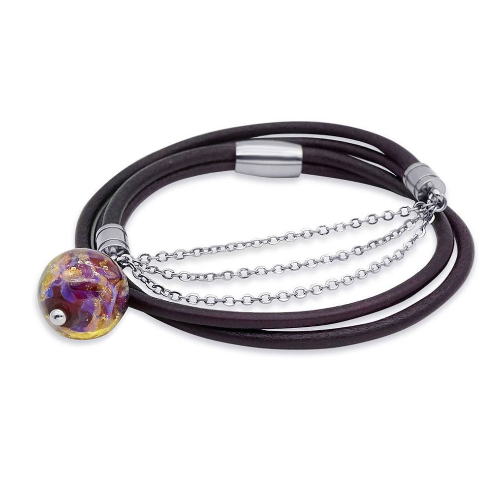 Браслет изготовлен из муранского стекла, натуральной кожи и гипоаллергенной ювелирной стали, что очень важно для людей с чувствительной кожей. Металл не темнеет и не подвергается воздействиям окружающей среды, надолго обеспечивая красивый внешний вид изделия. Крепкий магнитный замок надежно фиксируется на запястье. Ширина браслета - 1 см. Диаметр стеклянного шарика - 1,5 см. Вес - 15 гр.