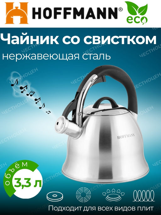 Чайник " HOFFMAN" изготовлен из высококачественной нержавеющей стали, что делает его весьма гигиеничным и устойчивым к износу при длительном использовании. Гладкая и ровная поверхность существенно облегчает уход за посудой. Чайник " HOFFMAN" который изготовлен из качественных материалов, при кипячении сохраняет все полезные свойства воды.­