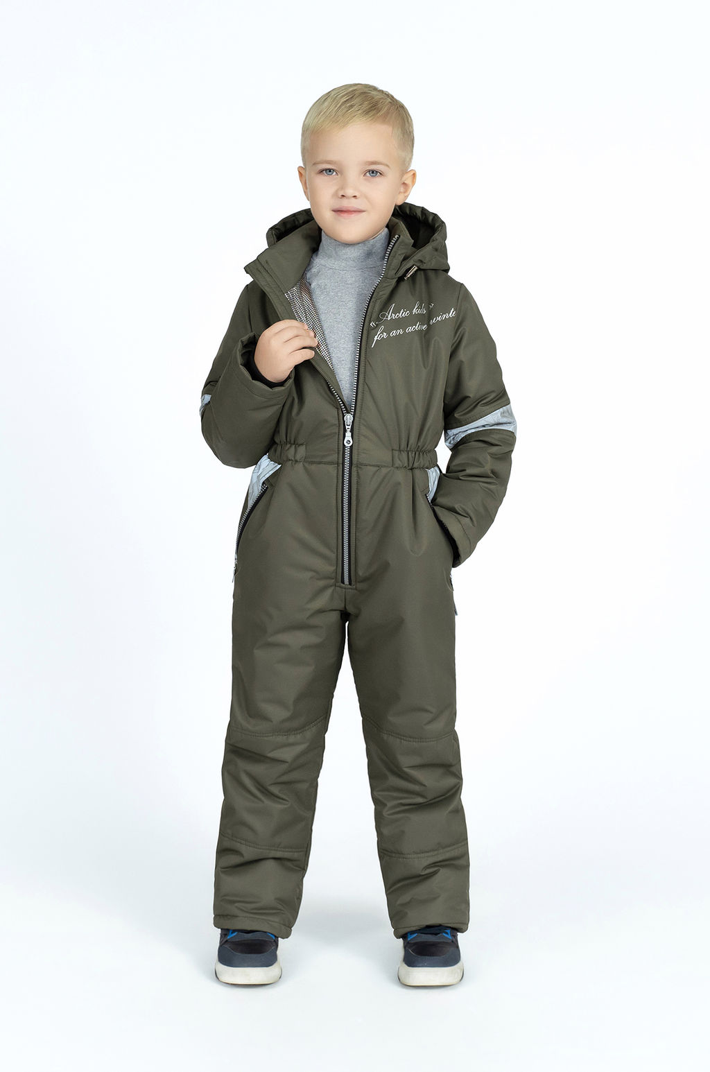 Детский зимний комбинезон для повседневной носки для мальчиков и девочек из мембраны цвета хаки. С прямой молнией застежкой с внутренней ветрозащитной планкой. Утеплитель тинсулейн 200гр/м2. Подкладка таффета термо. Капюшон в модели несъемный, регулируемый. В рукавах дополнительно двухслойные трикотажные манжеты. В штанинах есть дополнительные снегозащитные манжеты на резинке. Для основной части штанин и рукавов можно сделать отвороты, комбинезон будет расти с ребенком. По талии вшита резинка для более плотного прилегания. Светоотражающие вставки на рукавах и карманах.