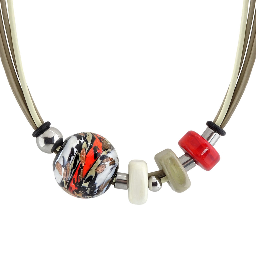 Колье изготовлено из натуральной кожи, муранского стекла и гипоаллергенной ювелирной стали, что очень важно для людей с чувствительной кожей. Металл не темнеет и не подвергается воздействиям окружающей среды, надолго обеспечивая красивый внешний вид изделия. Длина колье - 46 см + 5 см. удлиняющая цепочка. Размер стеклянных шаров - 2,2*1,8 и рандели 1,4*0,5 см. Вес - 44 гр.