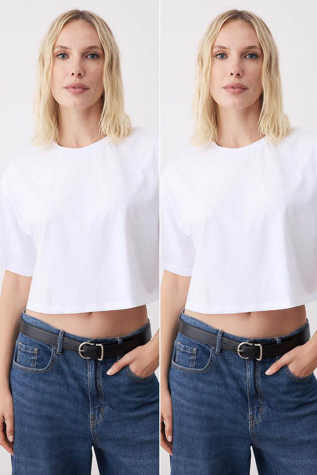• Beyaz-Beyaz 2li Paket %100 Pamuk Relax/Rahat Kesim Crop Orme T-Shirt TWOSS24TS00224