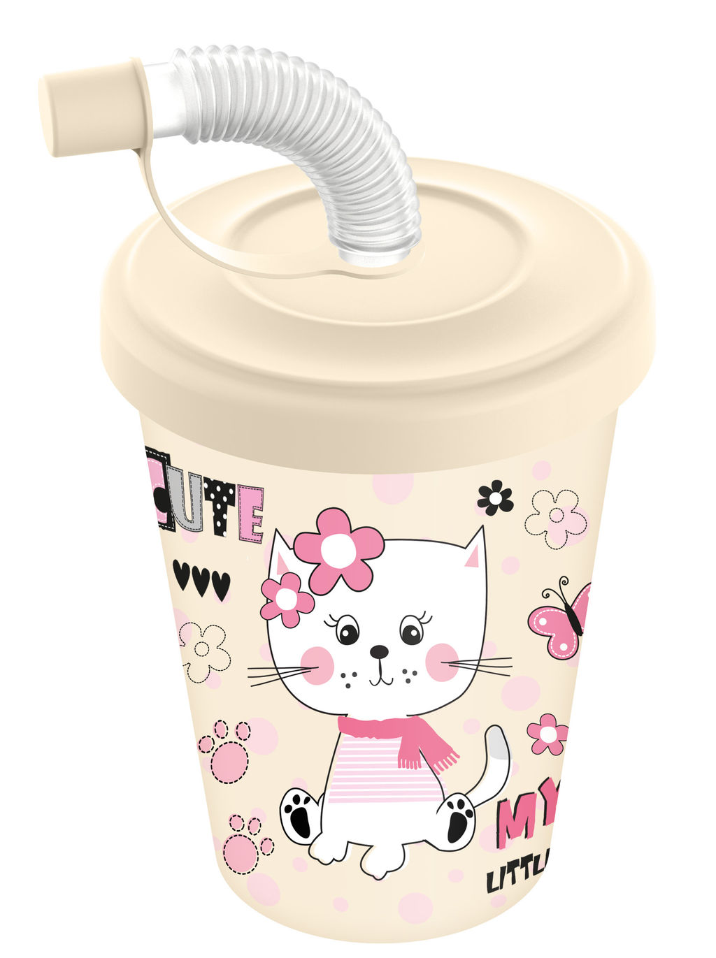 • Цена за 2 шт. Стакан детский с крышкой, трубочкой и колпачком 280мл с декором (светло-бежевый)221502725/01