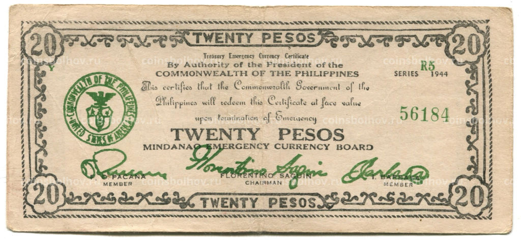 • Банкнота 20 песо 1944 года Филиппины (Минданао, Администрация США)