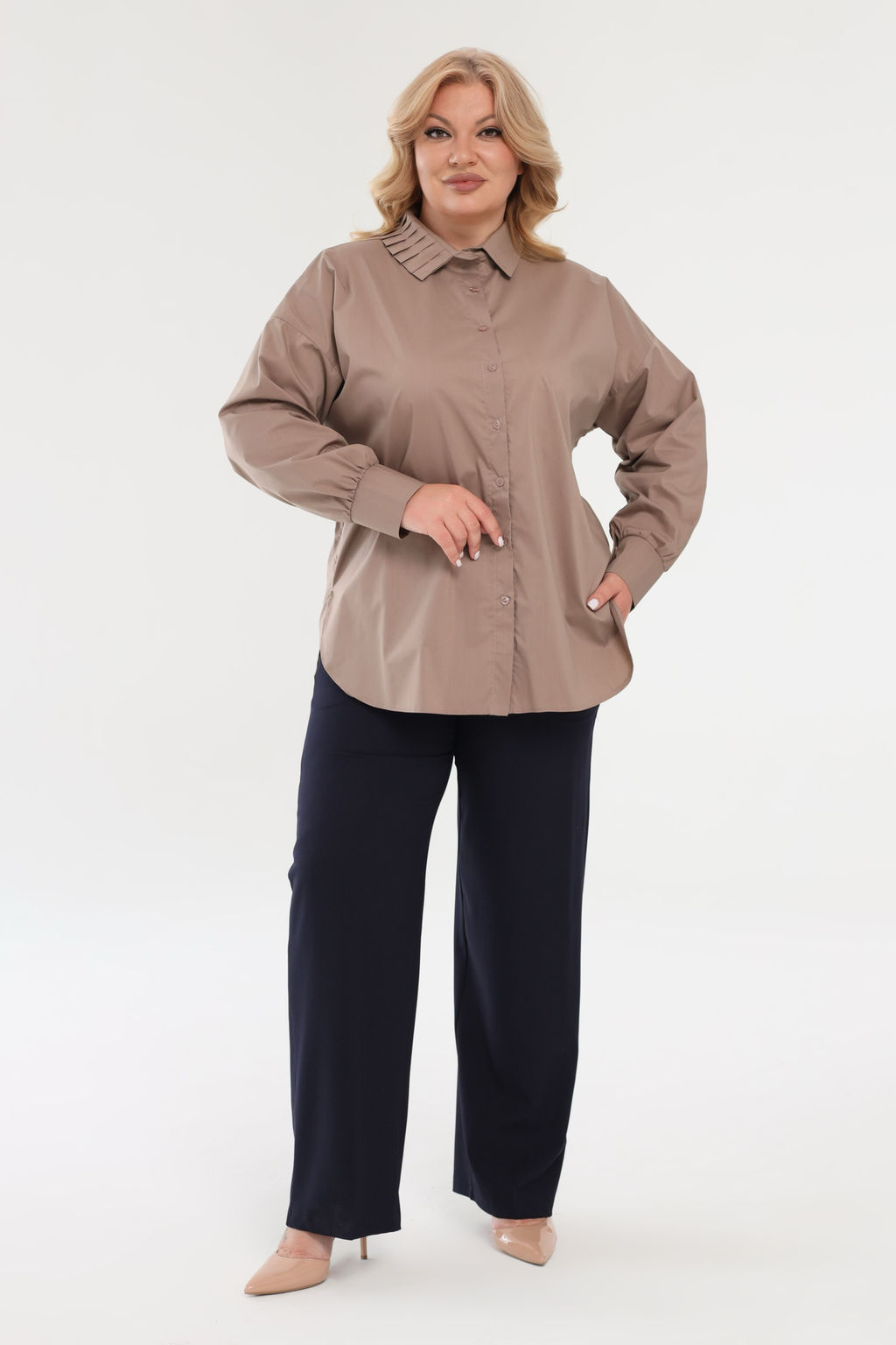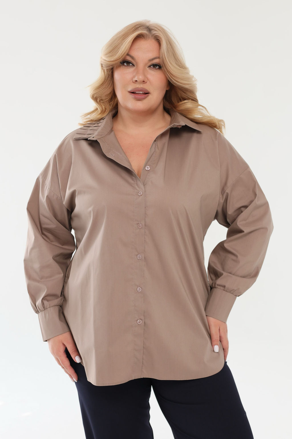 Удлиненная рубашка прямого кроя из мягкого материала - идеальный вариант для женщин, ценящих простоту и элегантность. Модель привлекает оригинальным дизайном. Рубашка застегивается спереди на пуговки под планку. Имеет классический отложной воротник, который сбоку декорирован небольшими складочками, что придает модели изящности и женственности. Приспущенные рукава полной длины застегиваются по низу на пуговки. Закругленные бока с небольшими разрезами обеспечивают оптимальную посадку по фигуре.  Свободный крой искусно обыгрывает силуэт, а мягкий, приятный телу материал подарит комфорт на весь день. Отлично подходит для комбинирования с брюками и юбками.­
